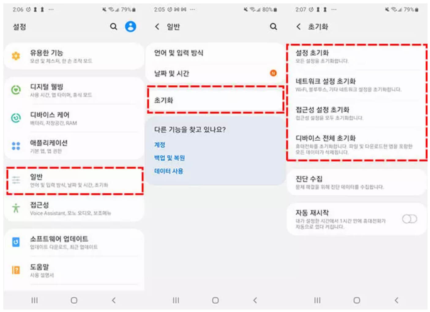 ⇢ 삼성: 휴대폰 설정 → 일반 → 초기화 → 기기 전체 초기화