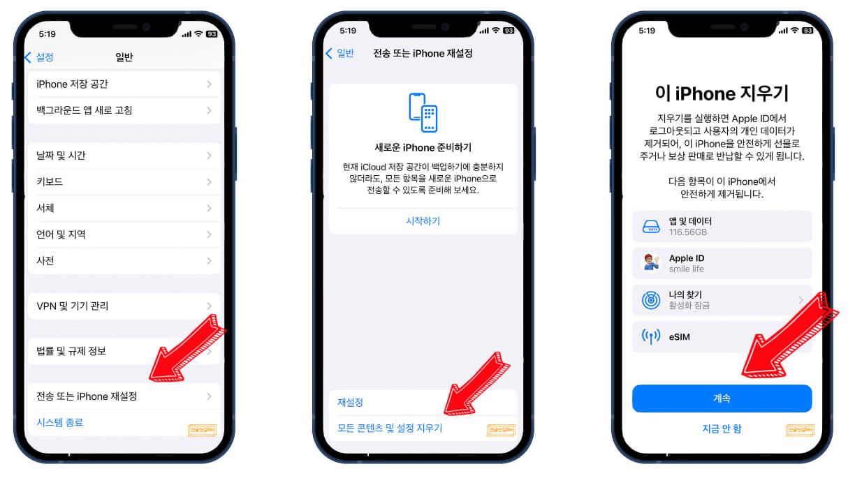 ⇢ 애플: 휴대폰 설정 → 일반 → 아이폰 재설정 → 모든 콘텐츠 및 설정 지우기