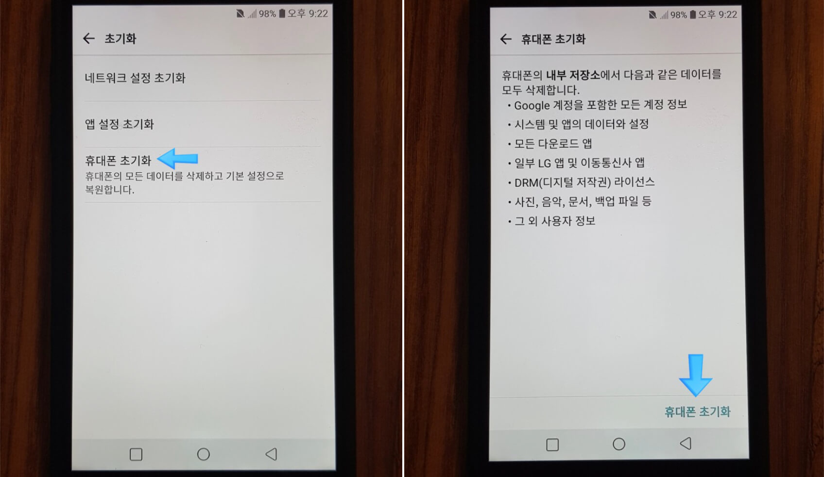 ⇢ LG: 설정 → 일반 → 백업 및 초기화 → 화면 오른쪽 아래 "휴대폰 초기화"